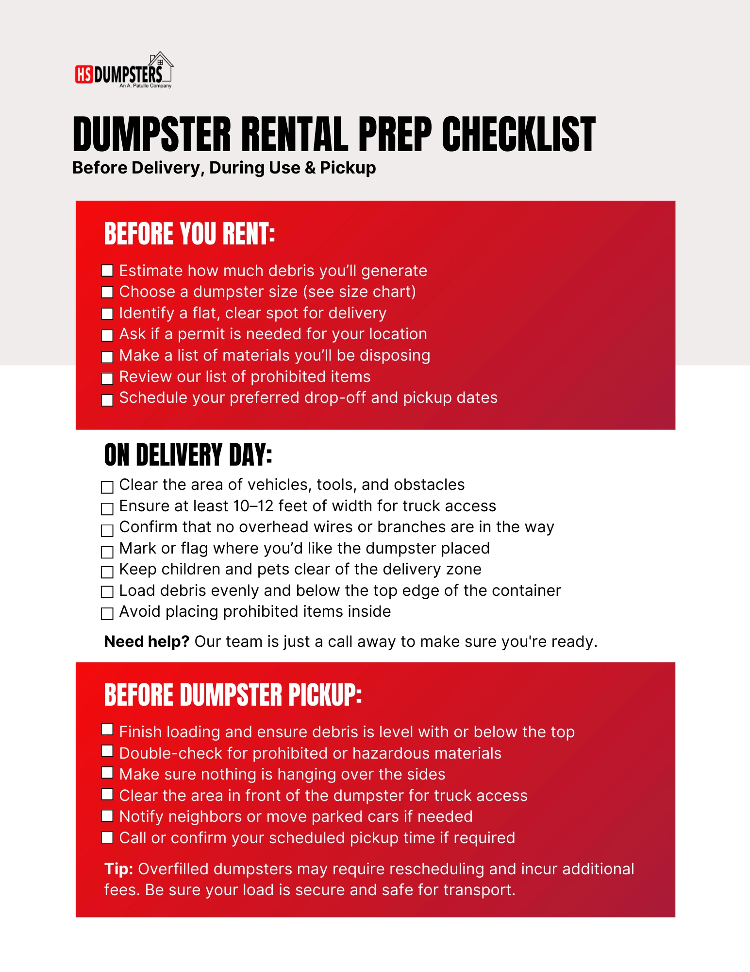Are you ready for your dumpster rental to arrive? Download our checklist for what to do before, during, and after your rental period.